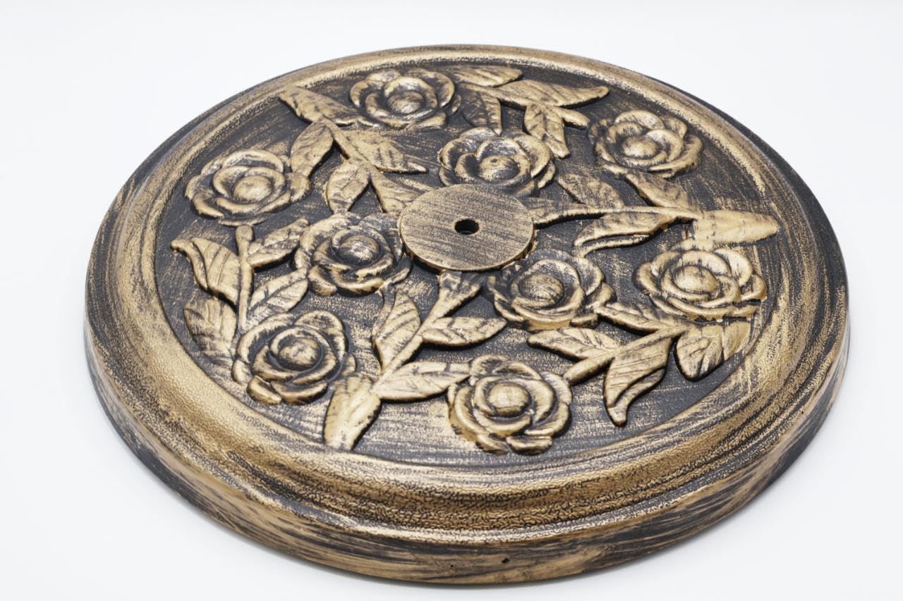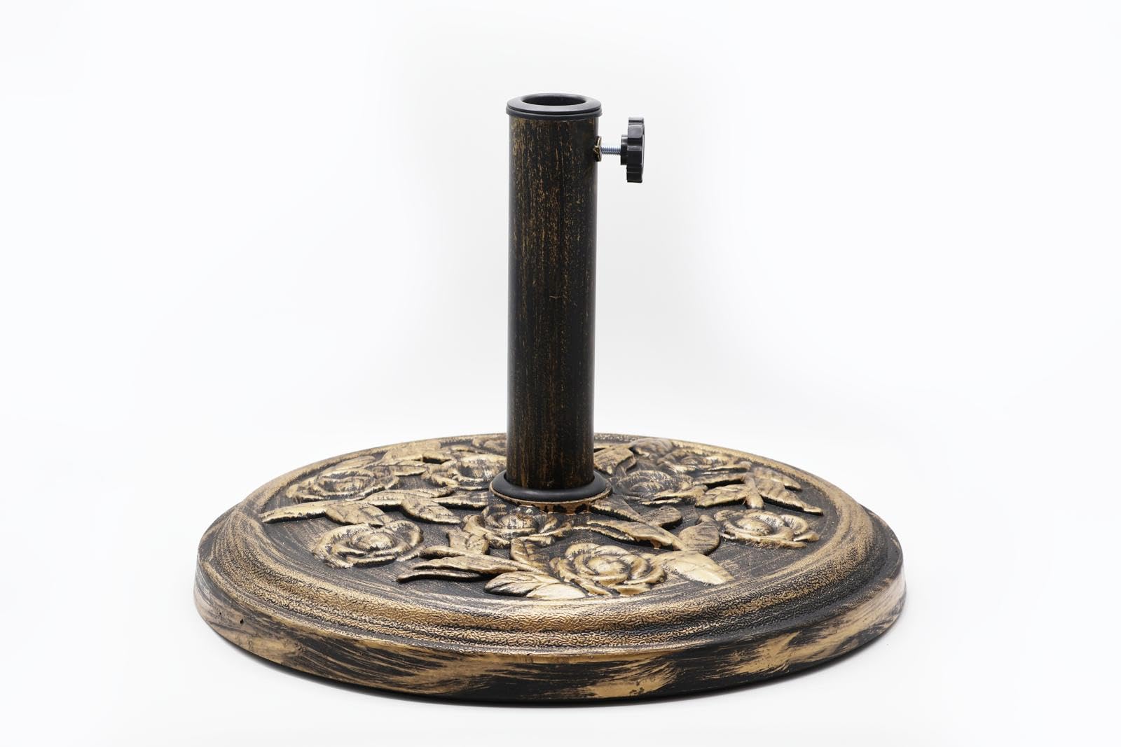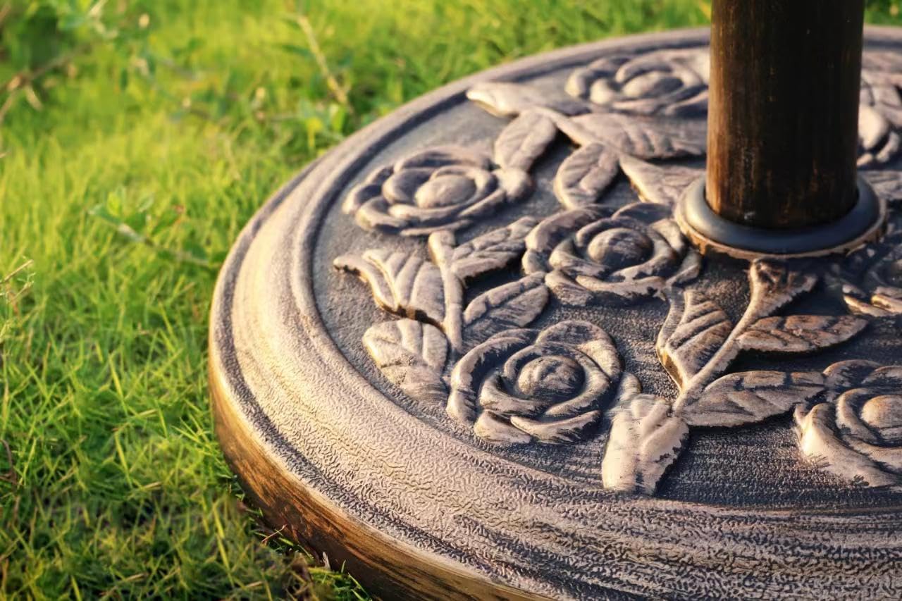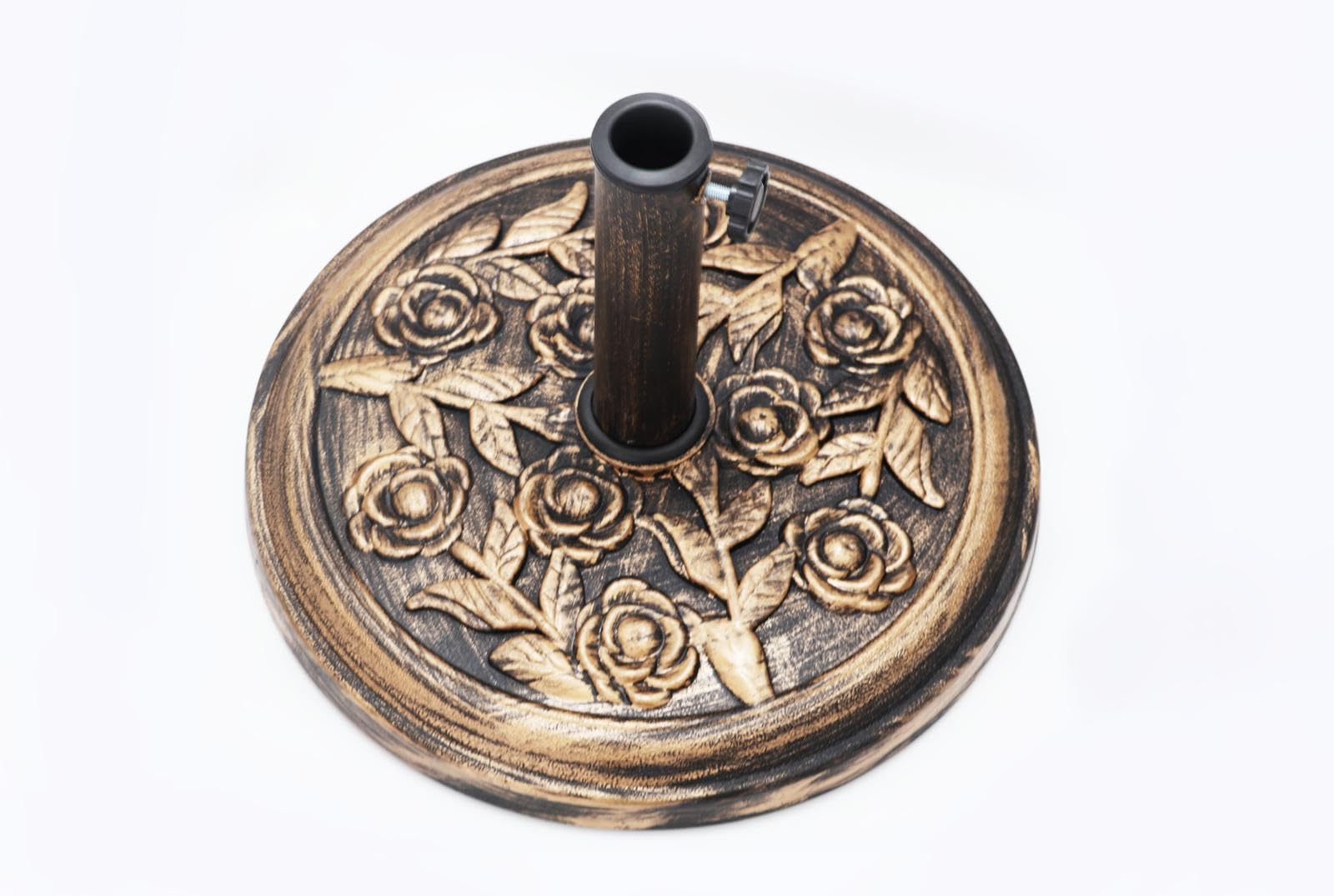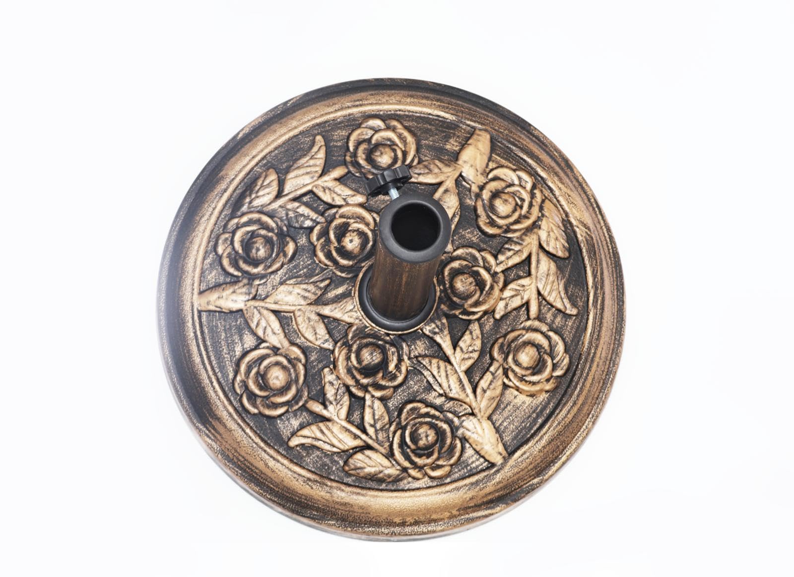 Specifications: Size: Diameter 45 cm * Height 32.5 cm Steel Tube: Diameter 55 mm * Height 245 mm Resin Base: Diameter 45 cm * Height 7 cm Color: Bronzing Umbrella Rod Diameter: Fits 32-48 mm Net Weight: 10 kg Description: The Roses Resin Parasol Base is the perfect blend of durability, style, and functionality for your outdoor spaces. Constructed from robust resin and iron, this heavy-duty base ensures long-lasting stability even in harsh weather conditions. The elegant floral design and bronzing finish add a touch of sophistication to any garden decor, while the wide base provides enhanced stability to keep your umbrella upright. This parasol base features a user-friendly rotary knob for easy securing or detaching of umbrellas, and includes rubber adapters to fit market-standard umbrella pole diameters ranging from 32 mm to 48 mm. Its all-weather finish ensures the color remains vibrant without fading, making it an ideal choice for patios, gardens, cafes, and other outdoor areas. With easy assembly and a universal design, the Roses Resin Parasol Base is a versatile and stylish solution for all your shading needs.